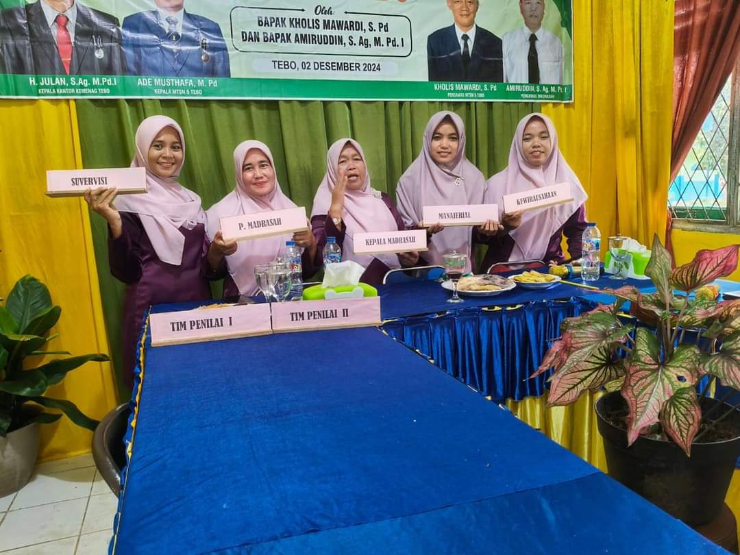 Kegiatan foto bersama ini turut dihadiri oleh Kepala Madrasah, Ade Musthafa, S.Pd.I., Ketua Tim Penilai Kholis Mawardi, S.Pd., Penilai II Amirudin, S.Ag., M.Pd.I., serta Kaur Tata Usaha Ainun, S.Pd.I., yang dengan penuh semangat mendampingi jalannya acara. Momen foto bersama ini menjadi simbol kebersamaan dalam menjalankan tugas untuk meningkatkan kualitas pendidikan dan kinerja di MTsN 5 Tebo.