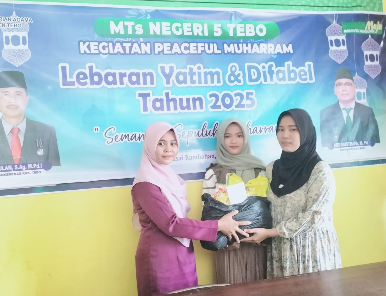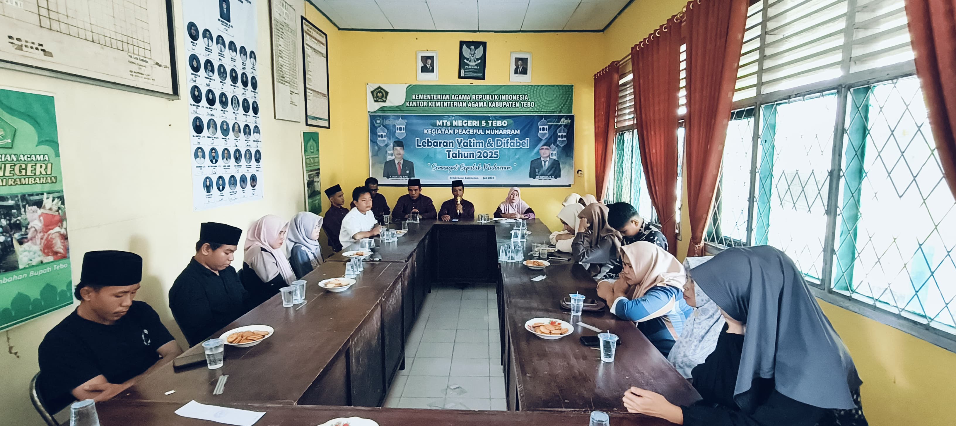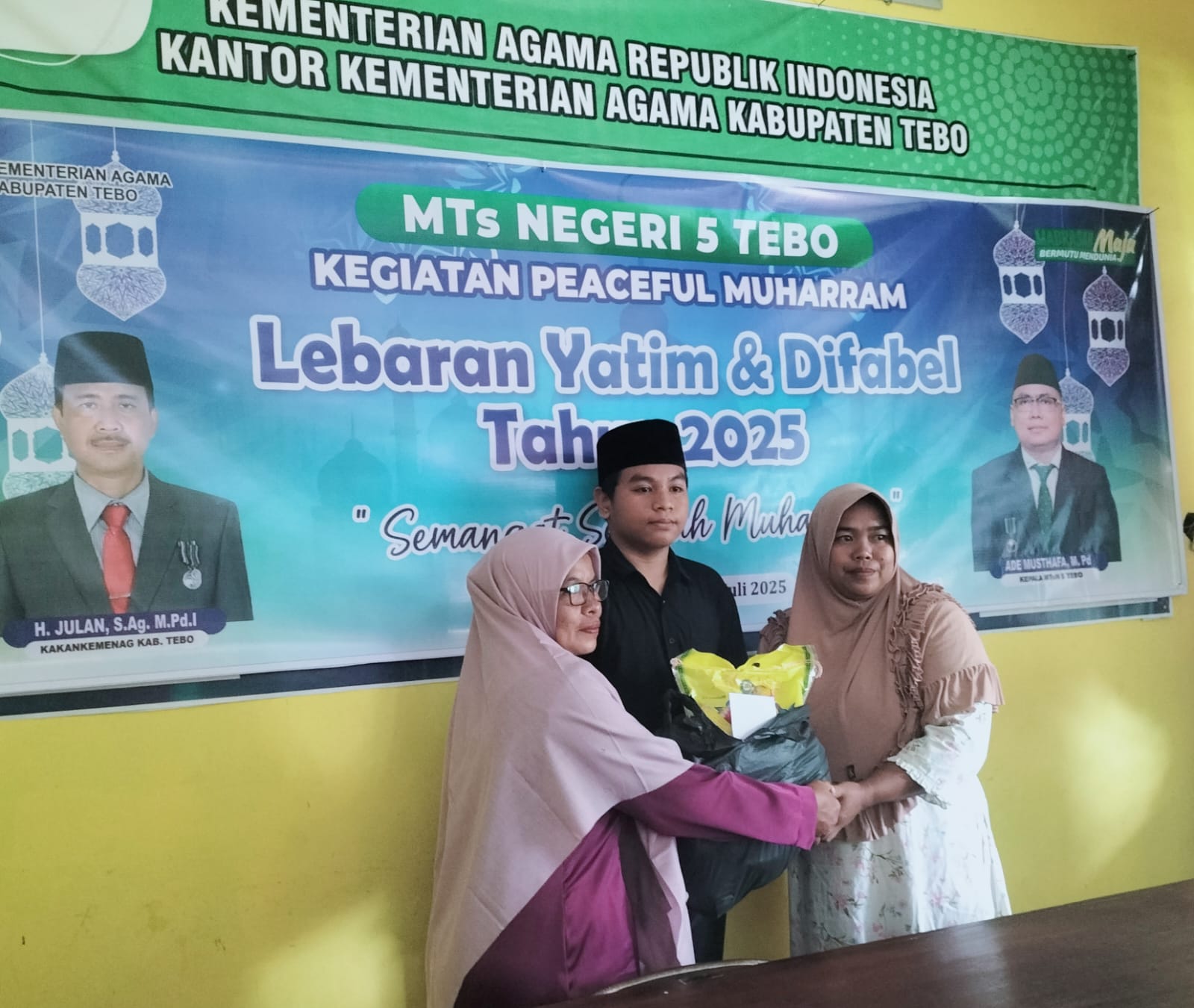 Tebo, 10 Muharram 1447 H — Dalam rangka memperingati 10 Muharram 1447 Hijriyah, Madrasah Tsanawiyah Negeri (MTsN) 5 Tebo menggelar kegiatan bertajuk "Peaceful Muharram", Jumat (5/7/2025). Kegiatan ini dirangkaikan dengan perayaan Lebaran Anak Yatim serta pemberian santunan kepada anak yatim dan penyandang disabilitas.
