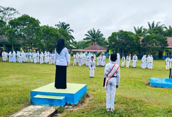 Bertindak sebagai pembina upacara, Ibu Calia Amelda, S.Pd., menyampaikan amanat yang penuh makna dan motivasi. Dalam pidatonya, beliau menekankan pentingnya membangun karakter yang baik di samping meraih prestasi akademik.