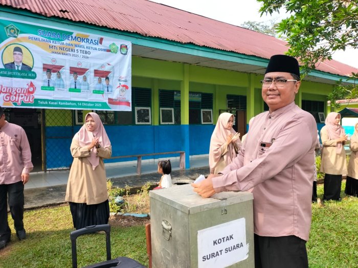 Selasa, 14 Oktober 2025 MTsN 5 Tebo kembali menggelar kegiatan penting dalam agenda tahunan madrasah, yakni pemilihan Ketua dan Wakil Ketua OSIM untuk masa bakti 2025/2026. Kegiatan ini berlangsung lancar dan demokratis, diikuti oleh seluruh warga madrasah dengan antusias tinggi. Acara dibuka secara resmi oleh Kepala MTsN 5 Tebo, Bapak Ade Musthafa, M.Pd., yang baru kembali aktif setelah menjalani masa pemulihan kesehatan selama enam bulan.